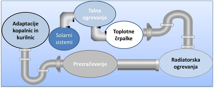 - Ogrevalne inštalacije na vse načine (centralno, toplotne črpalke, radiatorsko, talno, peči, oljni gorilniki, stensko, solarni sistemi, ogrevanje na biomaso, ...).